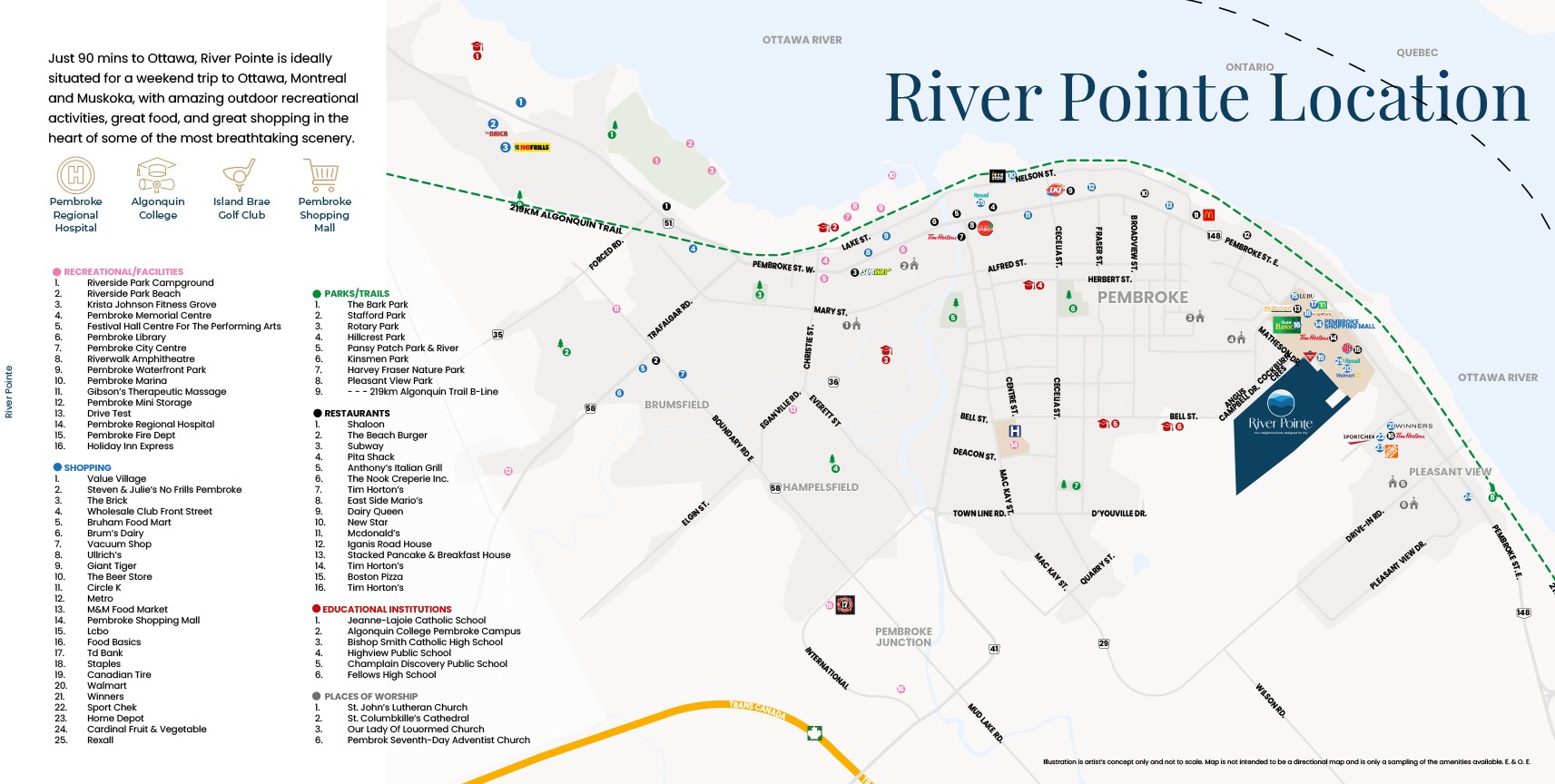 River Pointe is a picturesque new community of detached and semi-detached bungalow homes, coming soon to the scenic City of Pembroke in the heart of the Ottawa Valley. Nestled along the tranquil shores of the Ottawa River, River Pointe offers a rare blend of natural beauty and modern convenience. Residents will enjoy easy access to outdoor recreation, parks, and walking trails, all while being just minutes from downtown Pembroke, major retailers, the Pembroke Regional Hospital, the Trans-Canada Highway, and Algonquin College. This thoughtfully planned community is perfect for families, retirees, and nature lovers seeking a relaxed lifestyle just 90 minutes from Ottawa.