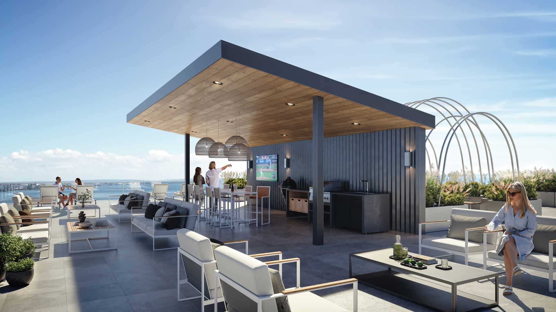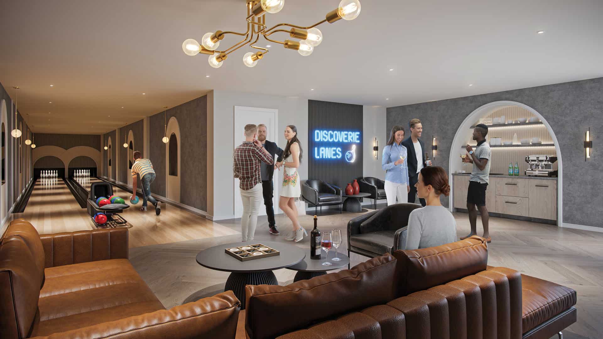 The Discoverie offers a range of upscale amenities, including a rooftop terrace with panoramic views, a state-of-the-art fitness center, a private bowling alley, a co-working lounge, and a party room known as The Shore Club.